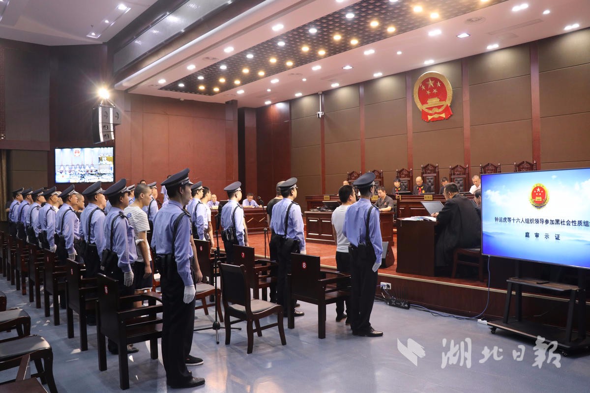 6月19日,武汉市蔡甸区人民法院一审公开审理了钟某等16名被告人涉黑案。该案涉组织领导、参加黑社会性质组织、聚众斗殴、寻衅滋事、非法拘禁、故意伤害、职务侵占、敲诈勒索、非法持有枪支、伪造国家机关印章、非法持有毒品、贩卖毒品等多项罪名。