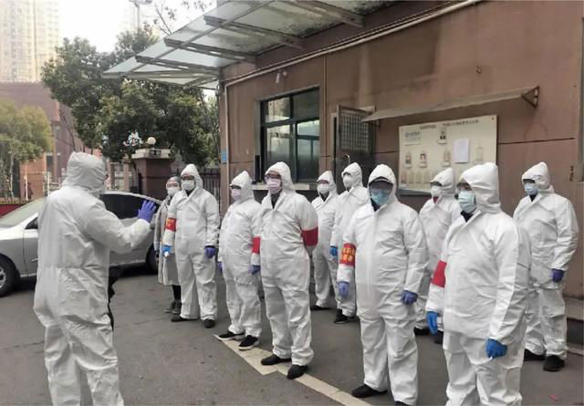 2月22日上午,湖北高院沙湖小区防疫工作队集结,挨家挨户测量登记居民体温。