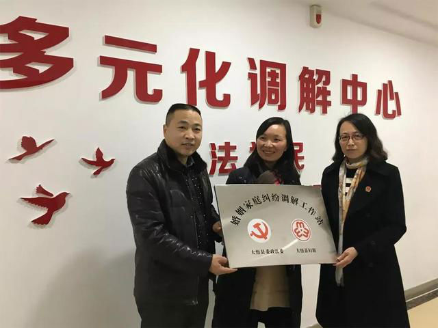2019年3月5日,孝感市大悟县委政法委、大悟县妇联在大悟法院多元调解中心挂牌成立了“婚姻家庭纠纷调解工作站”,大悟县委政法委副书记李睿、县妇联主席曾彩霞、大悟法院党组书记、院长刘杨萍、党组成员、副院长乐启源出席了挂牌仪式,并与法院立案速裁团队、家事少年审判团队干警举行座谈会探讨完善多元化调解纠纷机制,为有效化解家事纠纷、促进社会和谐探索新路径。